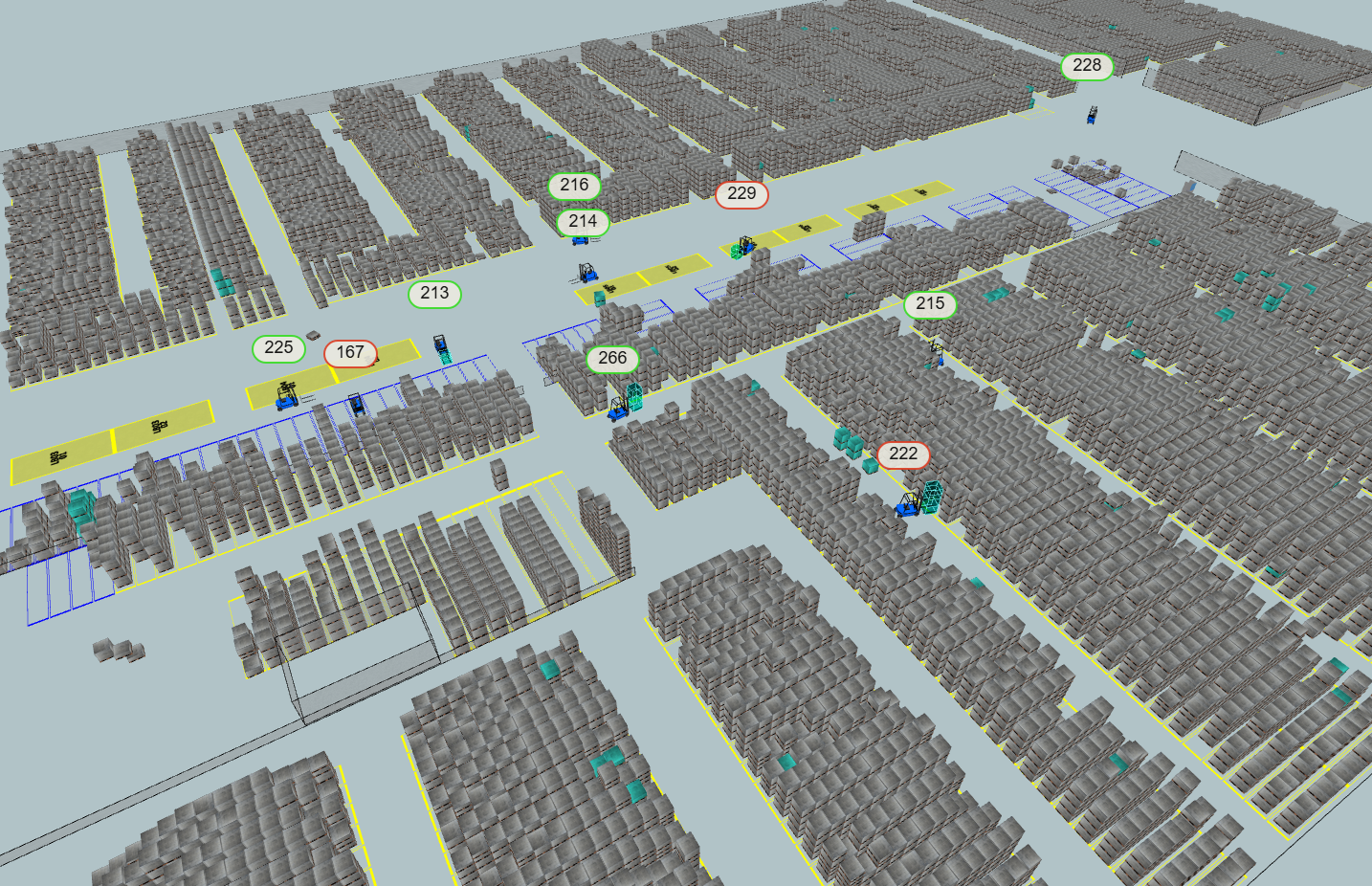 The manager view offers a boader perspective, showing the entire warehouse and the real-time position of all forklifts, pallets, and active transfer missions.