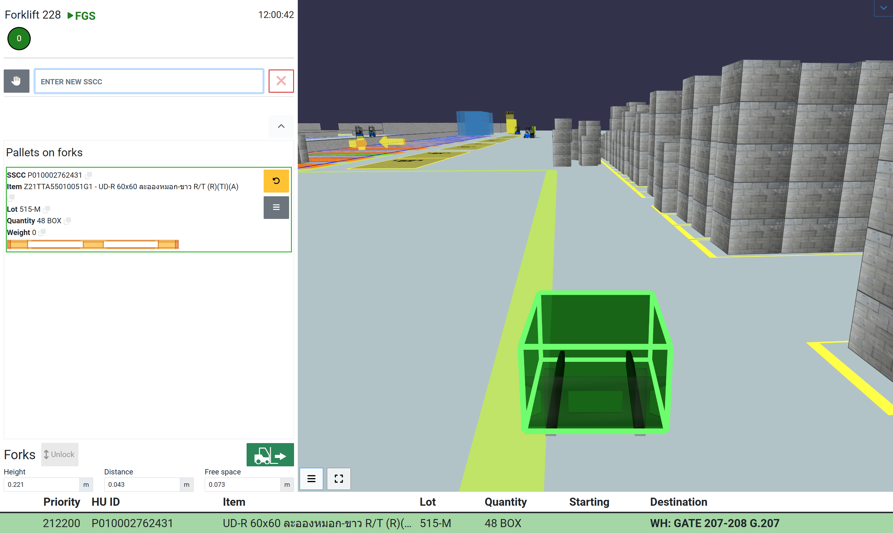 The driver view display a real time 3D representation of the warehouse centered on the forklift’s position.
